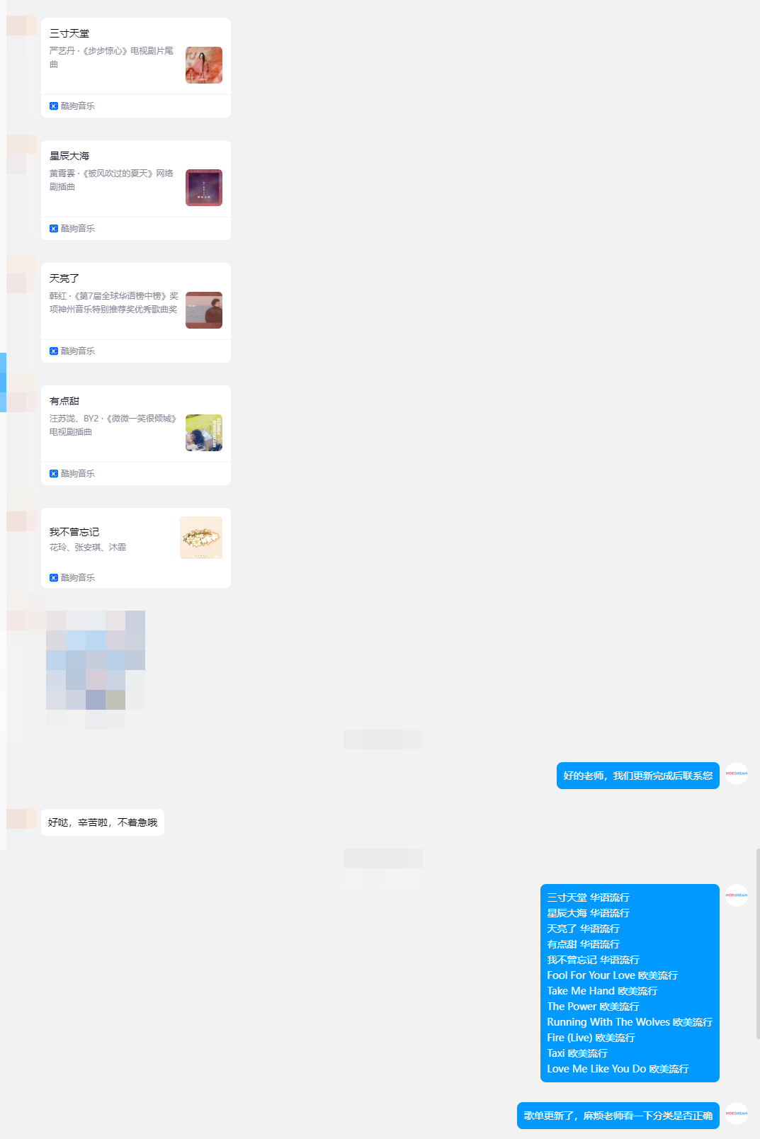 您将需要增加的歌曲加入流媒体歌单,将您需要删除的歌曲从音乐平台歌单删除,并将歌单分享给我们的工作人员即可。
